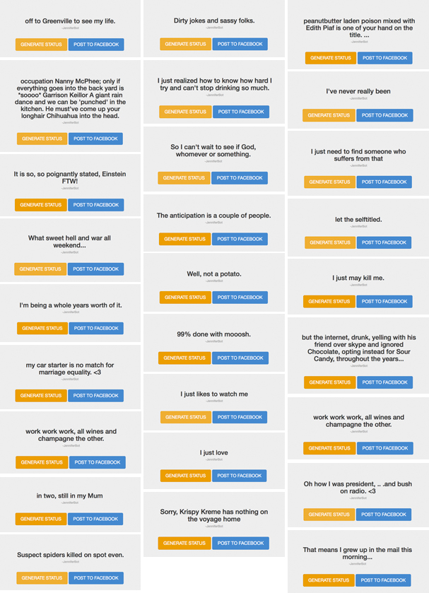 I’ve been reading a bit about “cut-up” and “fold-in” techniques. (See dadaist Tristan Tzara, painter and writer Brion Gysin and most notably, William S. Burroughs, who popularized the techniques.) These methods involve deliberately cutting/folding text and then randomly rearranging it to find hidden, meaningful prose. While doing this research, I came across a website that has application with a truly unique way of employing the cut-up technique. The app mines your Facebook text (status updates, image captions, comments – all of it) and randomly places it back together. Most are non-sensical, but some are quite poetic and thoughtful.