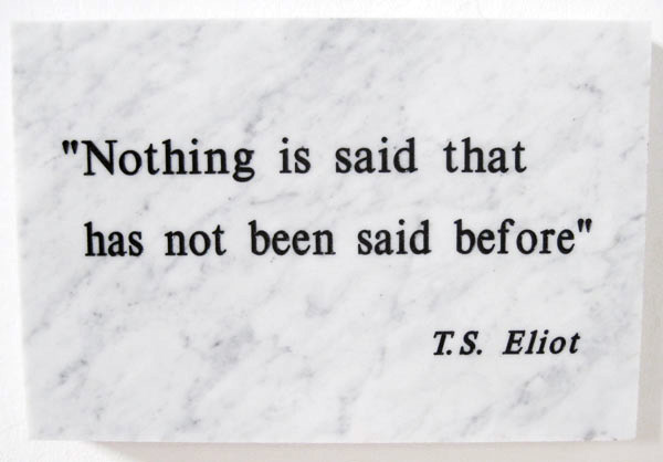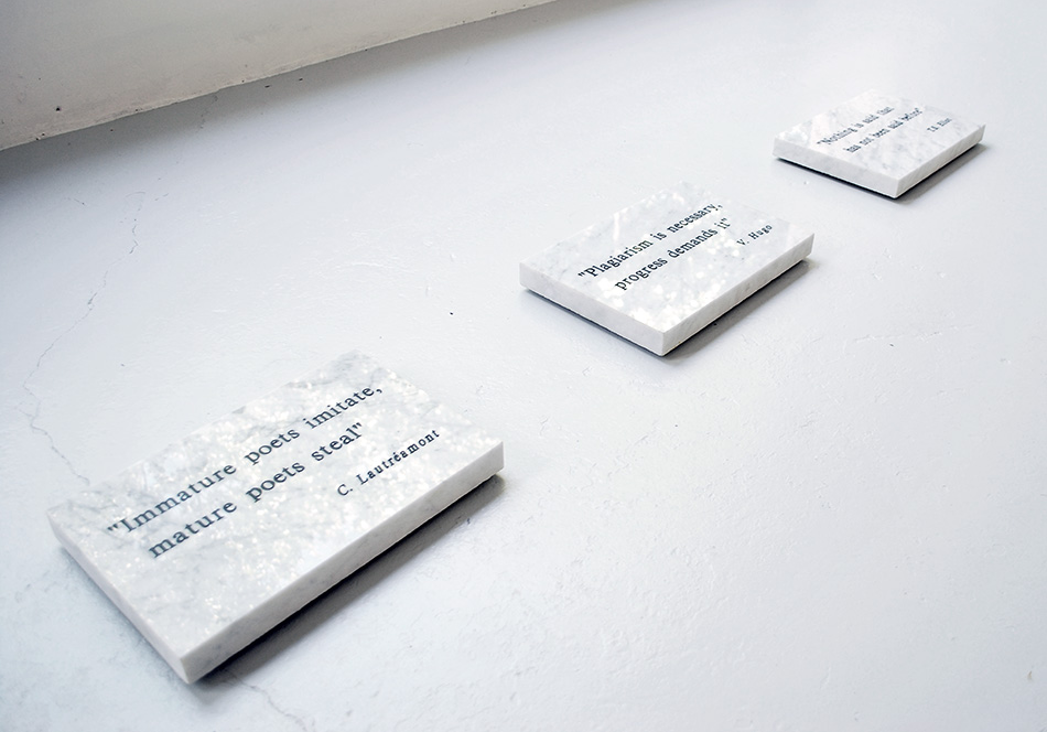 Engraved white marble. 30x19x4cm each (2007). Installation at “Nothing Political”, Komplot – Bruxelles 2010.